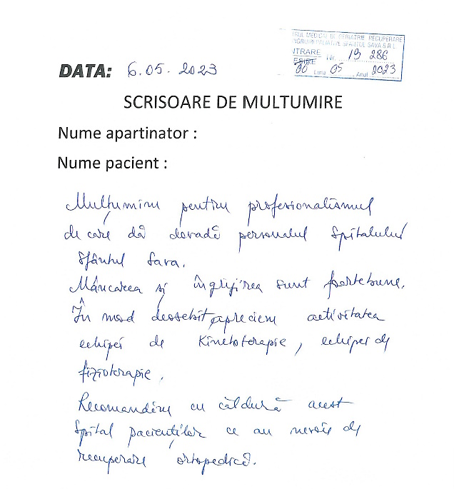 A fost operat de urgență și apoi a început recuperarea la noi, la Spitalul Sfantul Sava – Pantelimon Ilfov. La internare, putea să îndoaie genunchii doar foarte puțin, nu se putea mobiliza singur, nici măcar la marginea patului.